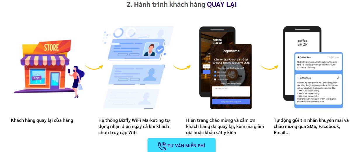 "Moma WiFi Marketing Giải pháp Marketing & Chăm sóc Khách hàng tự động thông qua WiFi. Moma WiFi Marketing giúp doanh nghiệp chăm sóc khách hàng qua 5 điểm chạm: - Khách hàng đến và truy cập Wifi miễn phí. Hệ thống tự động lưu trữ, nhận diện tình trạng khách hàng. - Khách hàng đăng nhập vào Wifi qua kịch bản được xây dựng sẵn. Cửa sổ trang hiển thị nội dung chào mừng, kèm theo thông tin khuyến mãi (nếu có). - Hệ thống tự động lưu trữ và bảo mật thông tin khách hàng vào CRM để sử dụng cho các chiến dịch quảng bá sản phẩm và chăm sóc khách hàng. - Tự động điều hướng truy cập đến những địa chỉ website doanh nghiệp muốn khách hàng theo dõi. -Moma  Wifi Marketing tự động gửi mã giảm giá, ưu đãi, lời chúc mừng vào các dịp đặc biệt qua SMS, Email,... đến khách hàng."