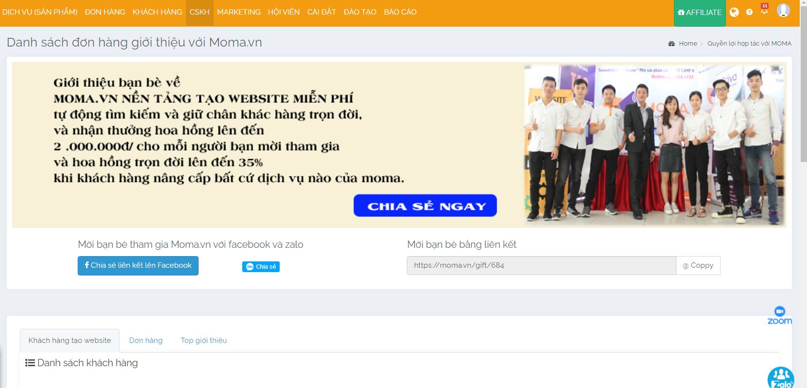 Chương trình liên kết moma à chương trình có sự tham gia của doanh nhân, giảng viên, người có ảnh hưởng và người sáng tạo nội dung. Họ là những người truyền cảm hứng và hướng dẫn cho đối tượng về hoạt động khởi nghiệp trên MOMA. Chương trình miễn phí tham gia, đồng thời cho phép bạn kiếm tiền từ đối tượng và nhận hoa hồng từ mỗi lần giới thiệu thương nhân mới trên MOMA